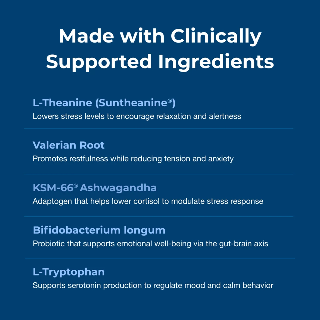 APOYO A LA CALMA – El L-triptófano favorece la producción de serotonina, ayudando a regular el estado de ánimo y a aliviar la ansiedad. La raíz de valeriana ayuda a reducir la tensión nerviosa y favorece la relajación. La L-teanina Suntheanine® contribuye a calmar el estado de alerta, ayudando a los perros a mantenerse relajados pero no somnolientos.