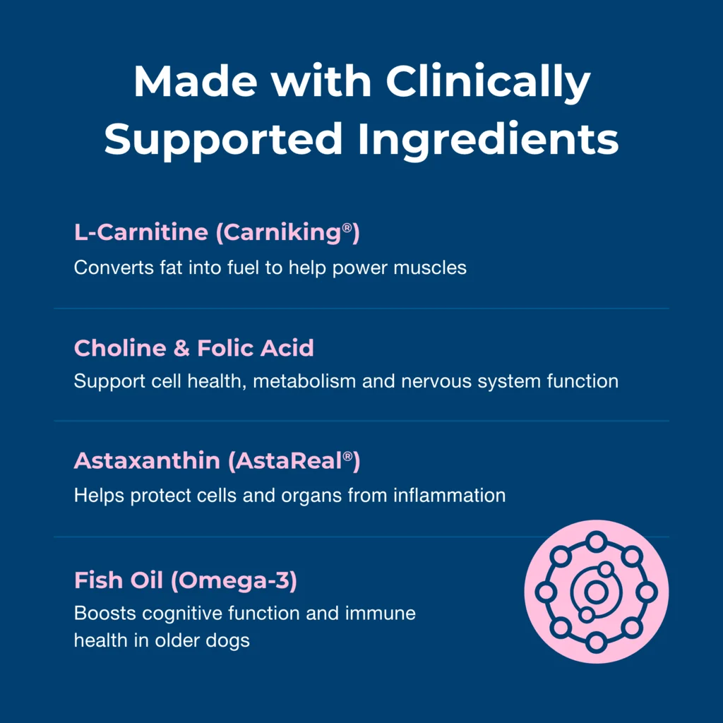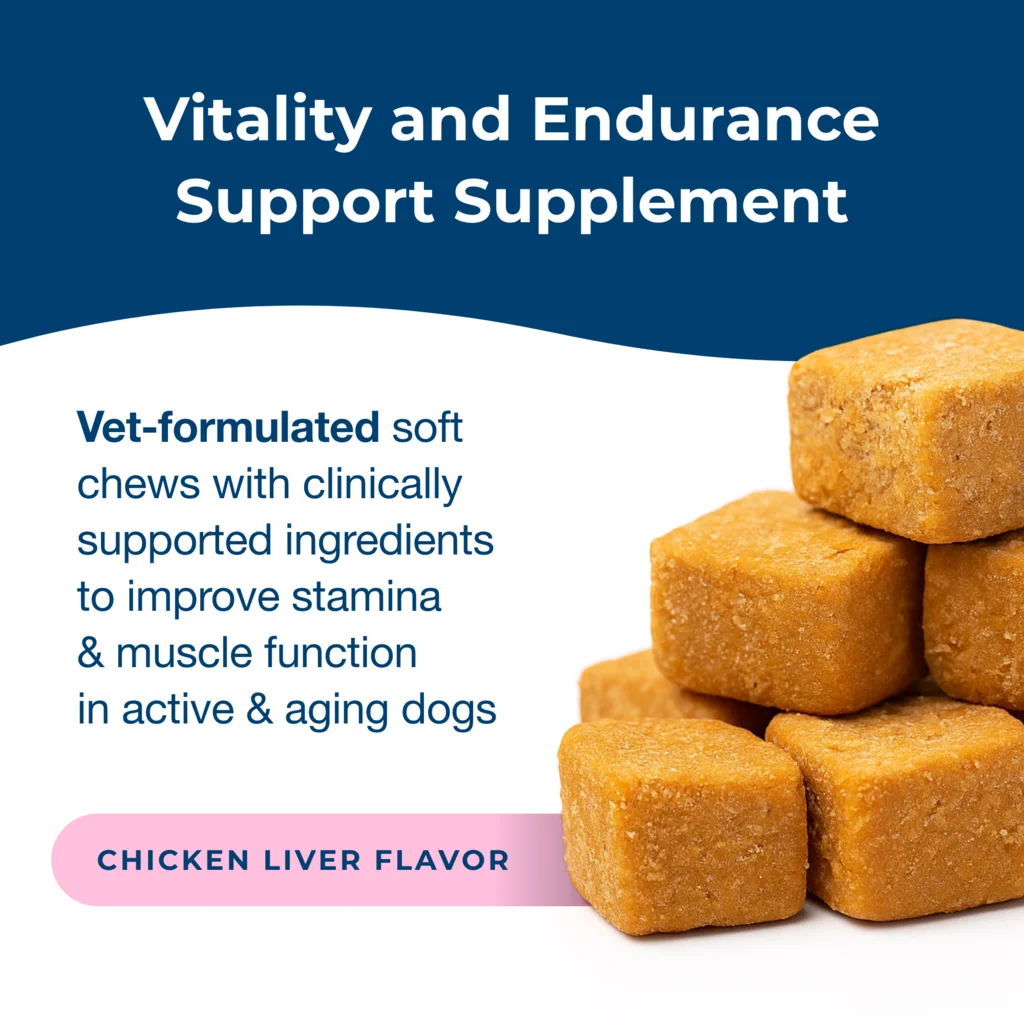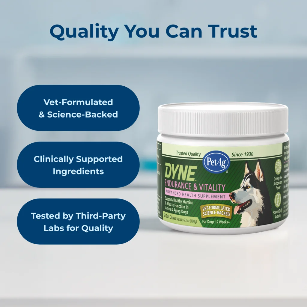 Dyne™ Endurance & Vitality Esta fórmula, formulada por veterinarios y avalada por la ciencia, proporciona ingredientes clínicamente probados que favorecen la resistencia, la función muscular, la recuperación y la reducción del estrés oxidativo en perros activos y de edad avanzada.