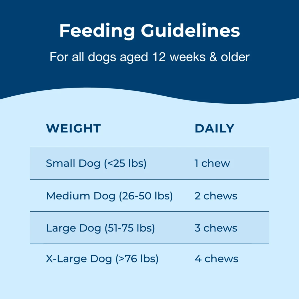 Modo de empleo: Suministrar 3 gramos (1 masticable blando) al día por cada 25 libras de peso corporal. Proporcionar agua fresca en todo momento. Consulte a su veterinario antes de usar, especialmente si su perro tiene una condición médica o está bajo medicación.