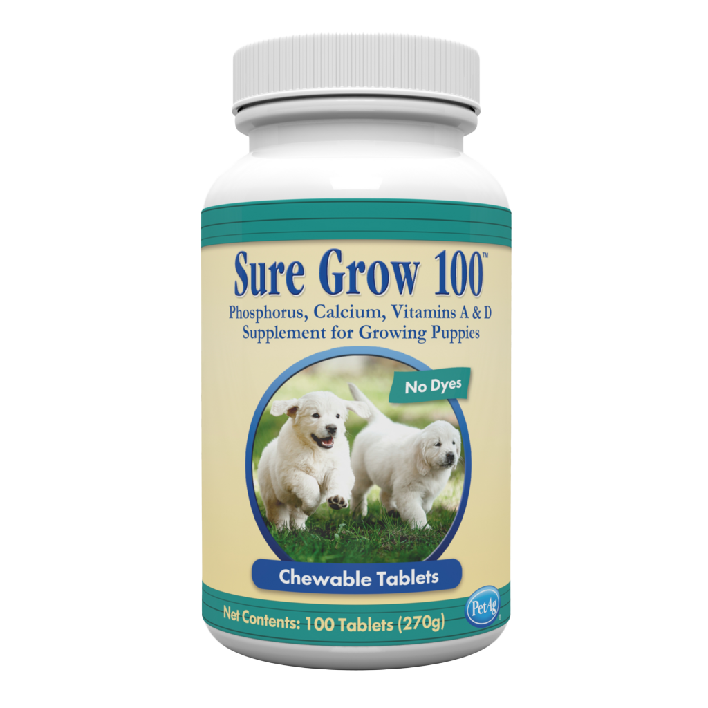 Sure Grow 100ª es un suplemento nutricional oral que ayuda a promover el desarrollo óptimo de huesos, ligamentos y tendones en cachorros de todas las razas durante los periodos de crecimiento rápido. Utilizado a menudo por criadores y adiestradores profesionales para obtener una estructura óptima de la raza, Sure Grow 100 está especialmente formulado para suministrar calcio, fósforo altamente disponible y vitaminas A y D.