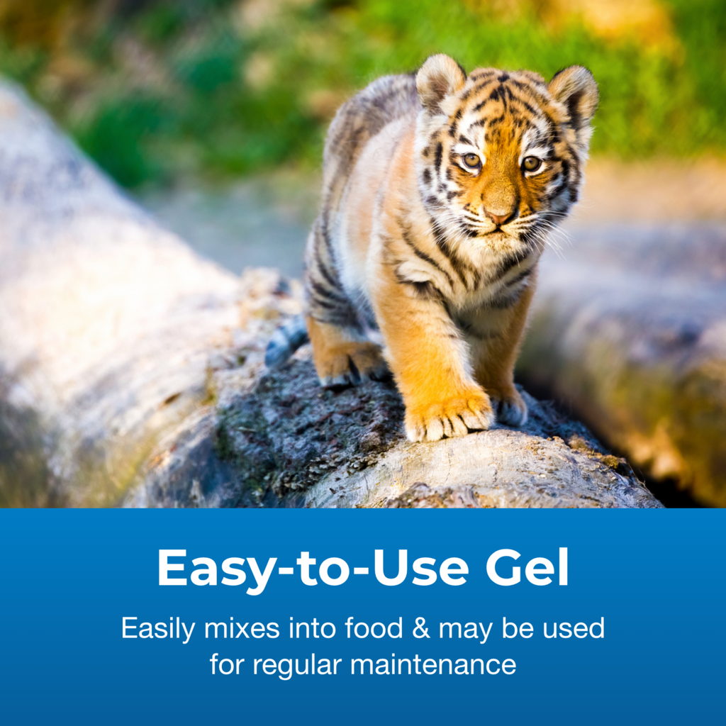 Post destete y mayores: 1 gramo hasta 10 libras de peso corporal. Un gramo adicional por cada 10 libras de peso corporal hasta 50 libras. Utilizar el gel 2 veces, con un intervalo de 3 días. Colocar en la boca o mezclar con la comida.